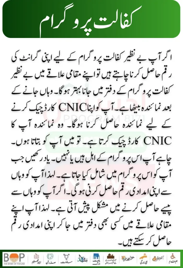 If you want to get your grant money for the Benazir Kafalat program, visiting theΒ Benazir Kafalat Program officeΒ in your local area would be best. After going there, the representative is sitting. You have to get the representative to check your CNIC card. That representative checks your CNIC card. So let me tell you. Whether you are eligible for this program or not. Remember when you are added to this program. So you have to get your aid amount from there. If you find it difficult to get money from there. So you can go to any office in your local area and get your aid money.