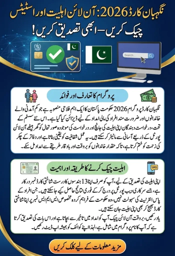 Verifying your eligibility for the Nigehban Card is straightforward. You only need your CNIC number and internet access. The online system is designed to confirm whether your household meets the program’s requirements.