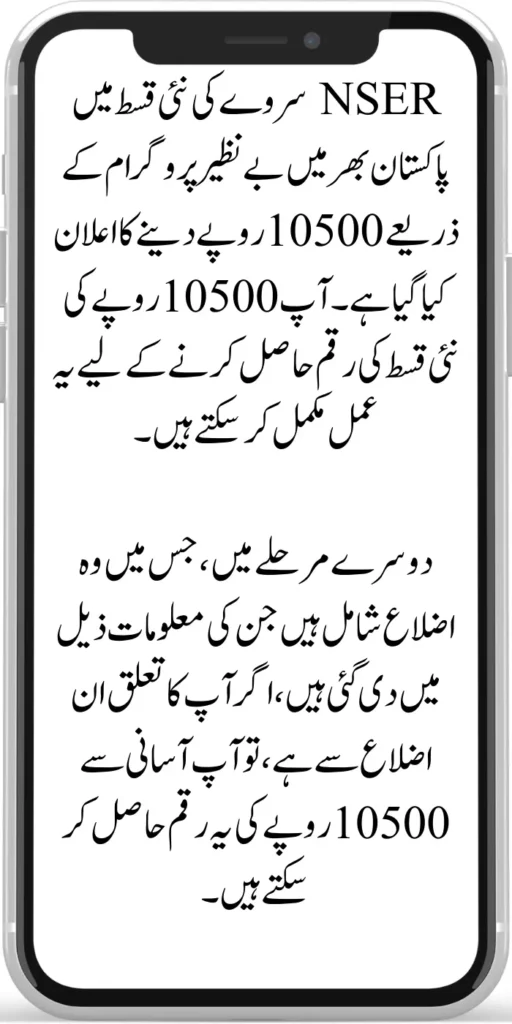 All the districts in the provinces of Punjab, Lahore, Sheikhupura, Nankana Sahib, Kasur, Faisalabad, Chiniot, Jang, Toba Tek Singh, Bahawalpur, Bahawalnagar, and Rahim Yar Khan are included. If you are from all these districts, then you can easily get Rs.10500 through the NSER survey. Its eligibility criteria and registration procedure are given below.