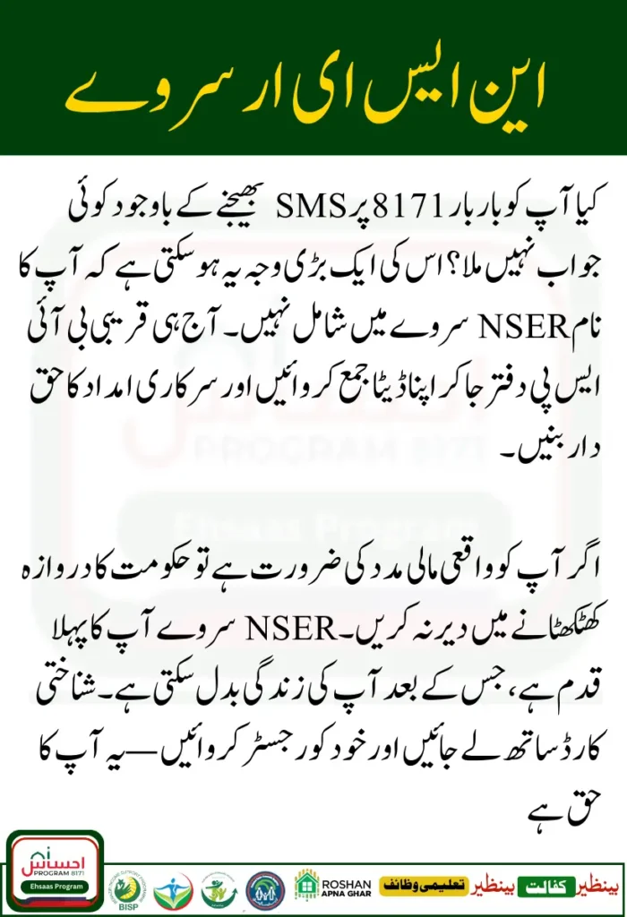 Agar aap NSER mein shamil nahi, to aapko BISP ya kisi bhi social program ka faida nahi milta — chahe aap 8171 par SMS bhejein ya portal use karein.