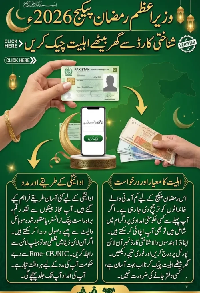 Prime Minister Ramzan Package 2026 is a crucial initiative aimed at helping low-income families across Pakistan during the holy month of Ramzan. Recognizing the financial pressure that many households face, the government has made it possible for citizens to confirm their eligibility and receive assistance in a simple and transparent manner. With the CNIC-based verification system, anyone can check their status online without the need for lengthy paperwork or unnecessary visits to government offices.