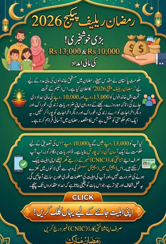 Ramzan Relief Package 2026 provides essential financial support to Pakistani families, offering Rs 13,000 and Rs 10,000 to eligible recipients. By using the online CNIC verification system, the government has made the process faster, safer, and more accessible. Families are encouraged to follow the official steps carefully to benefit from this valuable support during the holy month of Ramzan.