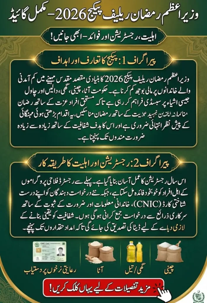 The Wazir-e-Azam Ramzan Relief Package 2026 is an important program that offers essential support to families facing financial challenges during Ramadan. By providing subsidized goods and potential cash assistance, the initiative ensures that deserving households can meet their basic needs and observe the holy month with dignity.