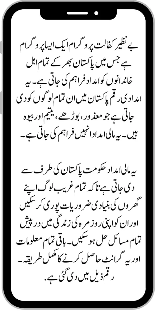 The Benazir Kafaalat Program is a program in which assistance is provided to all eligible families across Pakistan. This assistance money is given to all those in Pakistan who are disabled, the elderly, orphans and widows. This financial aid is provided to them.